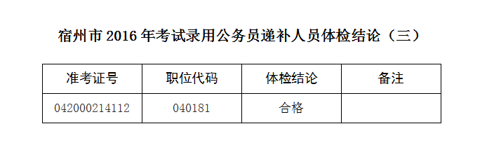附:宿州市2016年考試錄用公務(wù)員遞補(bǔ)人員體檢結(jié)論(三)